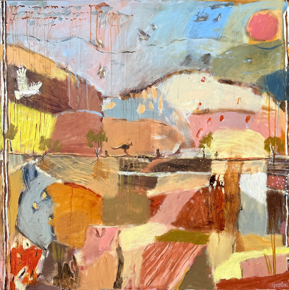 Greta Hounslow is an Australian artist known for her evocative paintings that draw deeply from her connection to nature and her extensive travels. Her work, which blends abstract forms with elements of Australiana and colourful patchwork landscapes, invites viewers into a rich, immersive experience that transcends time and place.
