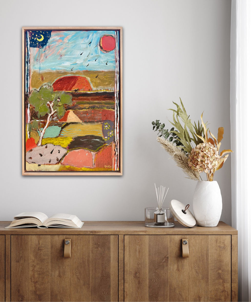 Greta Hounslow is an Australian artist known for her evocative paintings that draw deeply from her connection to nature and her extensive travels. Her work, which blends abstract forms with elements of Australiana and colourful patchwork landscapes, invites viewers into a rich, immersive experience that transcends time and place.